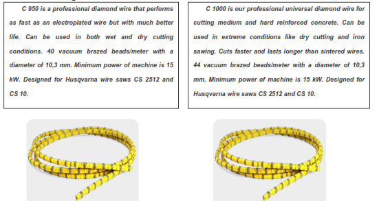 Founded in 1689 in Sweden, Husqvarna has a very extensive product range with everything from professional machines to products for demanding consumers. H We have diamond wires for a variety of jobs in most materials. Our diamond wires have U synthetic rubber and springs for the assembly. Synthetic rubber makes the wire very flexible S and easy to use. And you minimise the risk of uneven wear to the wire beads. Q Our latest wires have at least 40 beads per metre. This means increased contact between the cutting diamonds and the material, resulting in higher speed and extended tool life. The V smaller distance between the beads enables a more even cut. Husqvarna diamond wires are A ideal for marble, granite, reinforced and highly reinforced concrete, metal and cement blocks cutting.